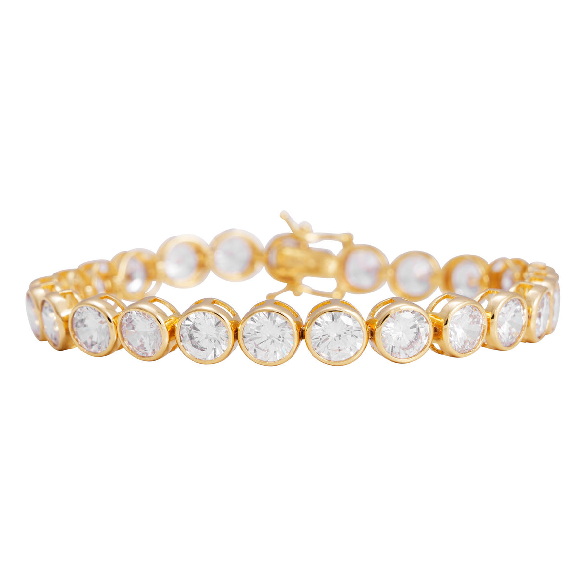 Gold-glow drip. A full line of round-cut sparkle sits in smooth “bubble” bezels, giving you luxe shine with a softer, modern vibe. It’s the bracelet that makes a sweats feel styled and a slip dress feel expensive. Why you’ll love it?...All-around bezel-set stones = nonstop sparkle, snag-free. Lies flat and comfy on the wrist (everyday friendly) and has secure box clasp so it stays put from brunch to dance floor.