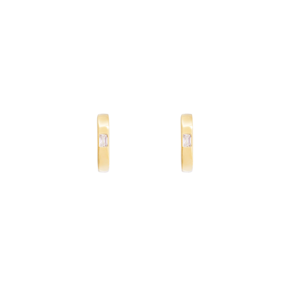 Minimal, but make it luxe. The Hollie huggies are classic gold mini hoops topped with a sleek rectangular crystal that catches the light like it was made for golden hour selfies.