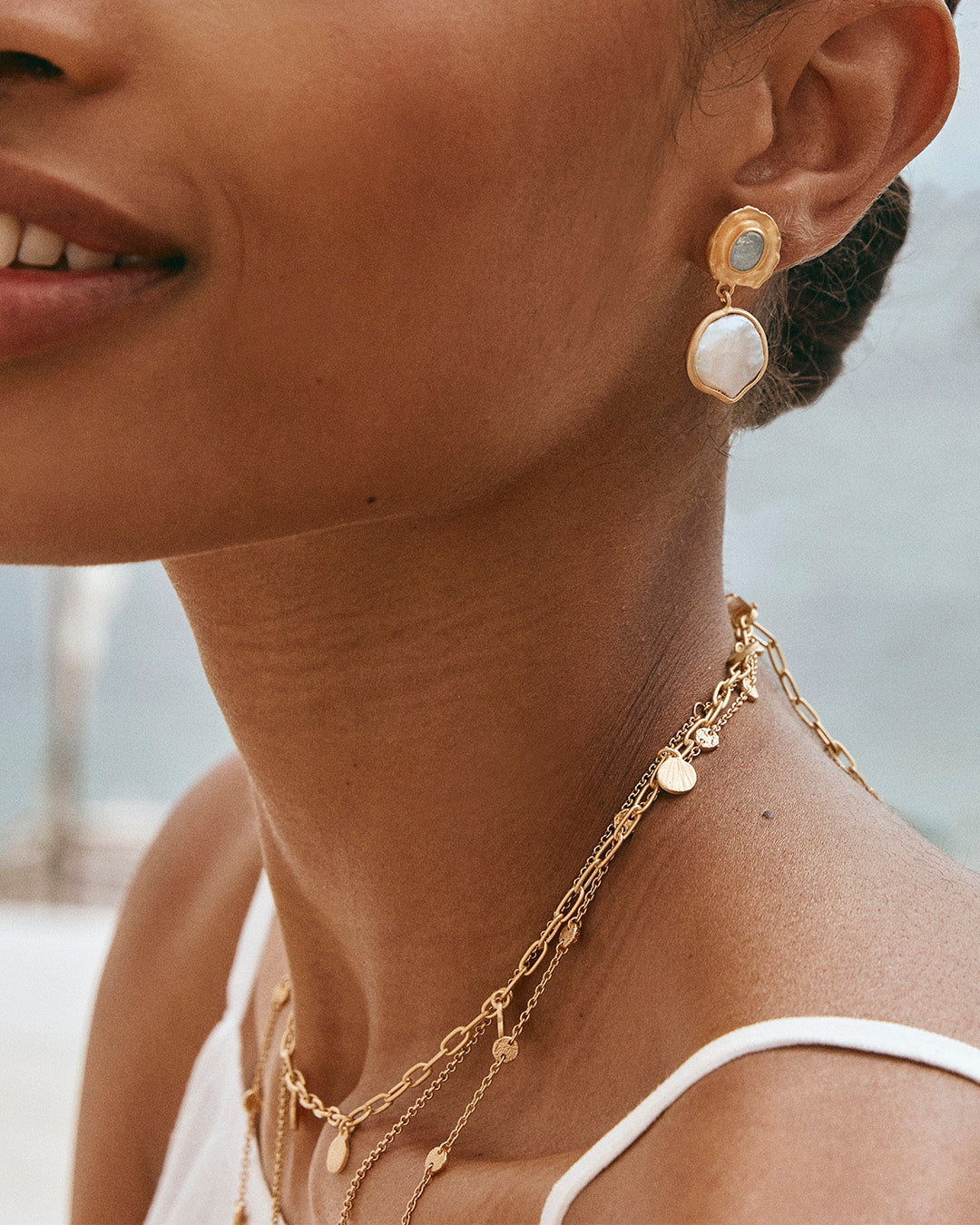 A captivating blend of oceanic charm and timeless elegance, the Aquamarine Pearl Drops feature luminous freshwater pearls suspended beneath faceted aquamarine stones. Each earring is crafted in sterling silver with 18k gold plating, offering a luxurious finish that complements both day and evening wear. The calming blue tones of aquamarine paired with the soft iridescence of pearls create a sophisticated statement—effortlessly graceful and naturally eye-catching.