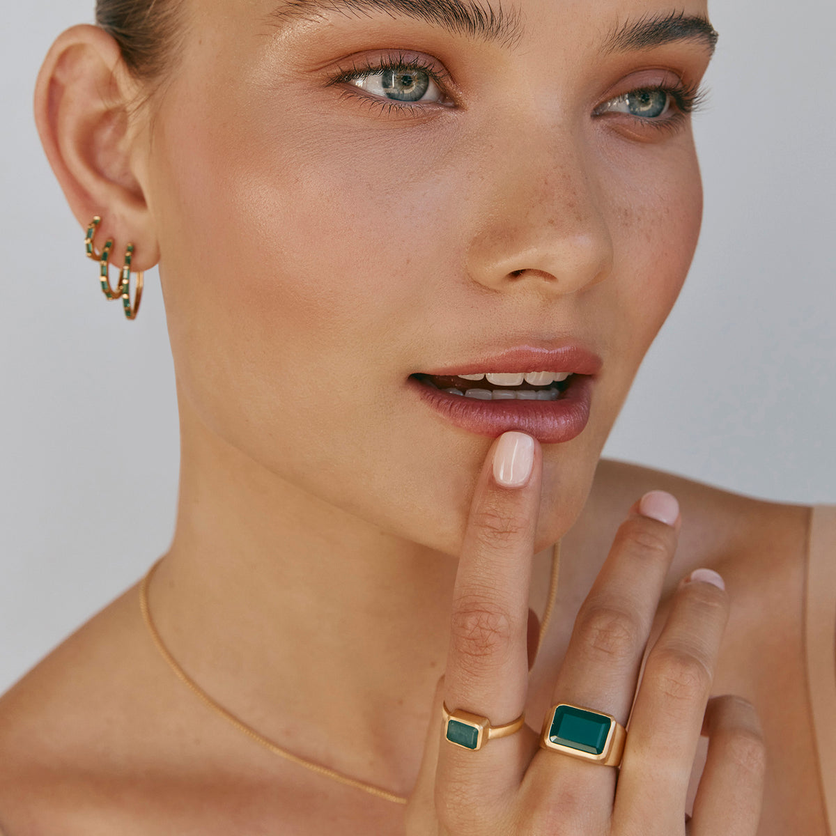 Bold and elegant, the Emerald Deco Ring channels vintage glamour with a modern edge. Featuring a captivating emerald set in 18k gold-plated sterling silver, this statement piece is inspired by Art Deco design. The clean lines and striking symmetry highlight the vivid colour and timeless sophistication of the stone, making it a standout addition to any jewellery collection.
